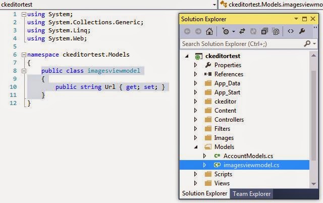First let's create a viewmodel for holding the imageurl(the image url contains the image name also). So right click on the model folder and create class file and name the class file imagesviewmodel.cs. Paste the following code in the viewmodel.